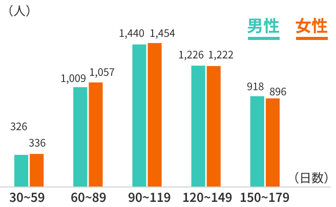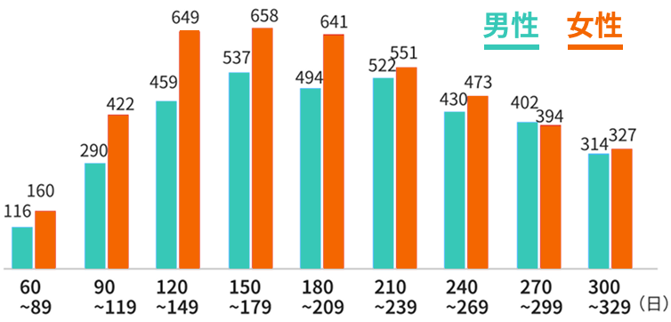 成婚者の活動日数は、男女ともに「150~179日」が最も多く見られます。男女別の中央値では、男性が303日、女性が251日となっており、女性の活動日数は男性よりも短い傾向があります。